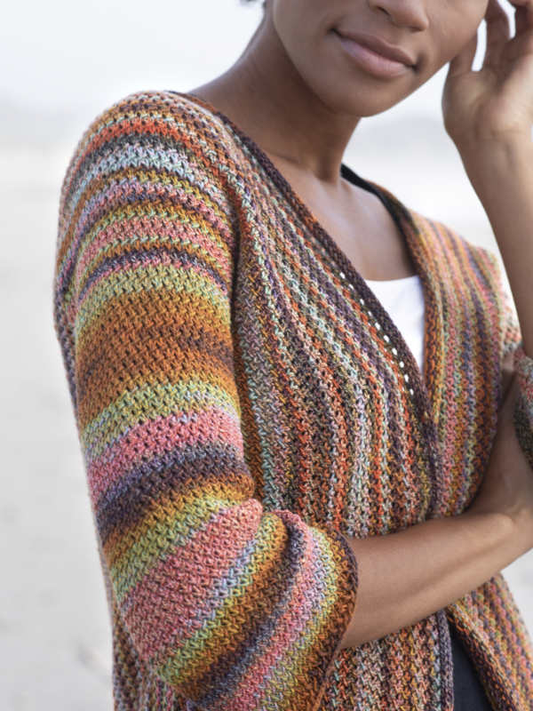 This cheerful cardigan shows off the beautiful colors of Berroco Medina! Knit from the sleeves to the body, this cardigan knitting pattern features an I-cord cast on, simple stitch pattern, and open fronts.