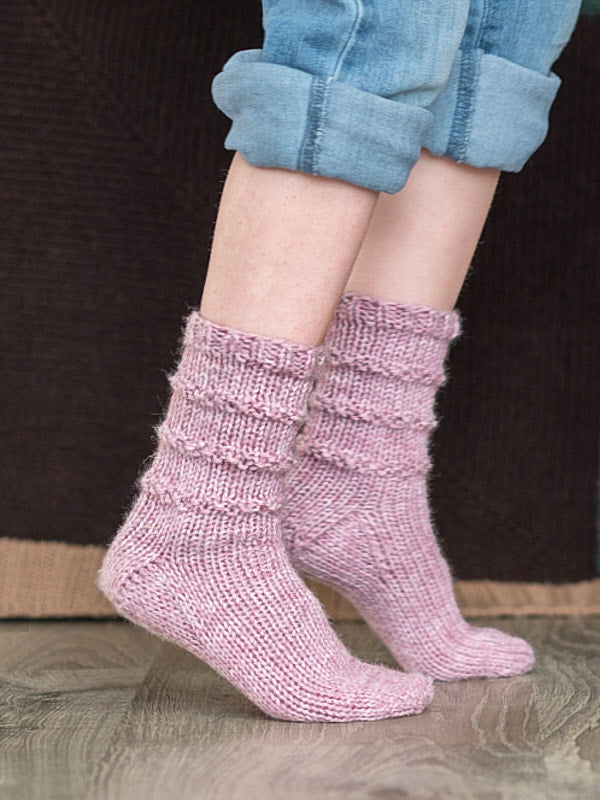 A sweet pair of knitted socks worked from the top down with heel and gusset shaping.