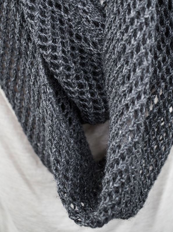 Kurama is an infinity scarf featuring two lace pattern stitches, one of which has a jagged edge that frames the face and neckline beautifully.