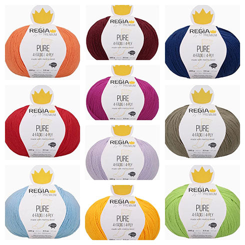 Price is for 10 skeins of Regia Premium Pure yarn. One skein per color, colors selected by Little Knits. PHOTO IS A SAMPLE; BAGS WILL HAVE DIFFERENT COLOR COMBINATIONS.